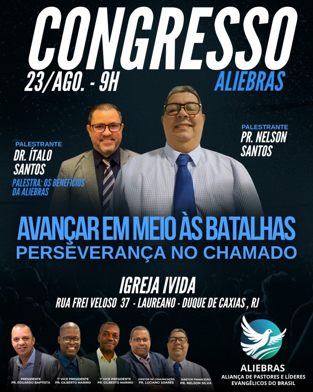 A diretoria da ALIEBRAS é formada por pessoas de Deus comprometidos com o Reino, com vasta experiência ministerial e liderança reconhecida em diversas regiões do país. Juntos, servem com excelência, sabedoria e temor ao Senhor, guiando a Aliança com visão, unidade e propósito.